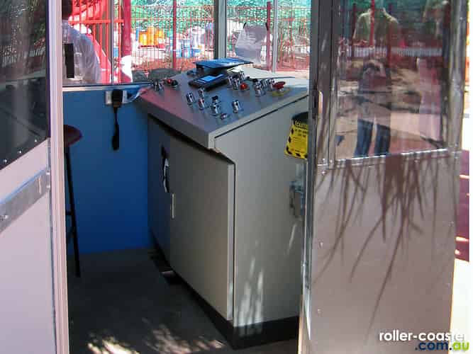 The ride's control panel in the main operating booth, where theming work has gone ahead to blend it in with the surroundings.