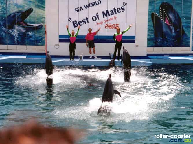The "Best of Mates" show at Sea World, which showcased a variety of tricks from several different species of dolphins, including Bottlenose dolphins and Pilot whales. This was found where "Quest for the Golden Seal" is now located.