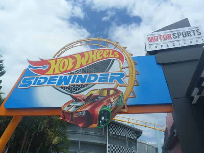 The entrance signage. Early announcements for the ride dubbed the attraction the "Hot Wheels Hot Lap Coaster".
