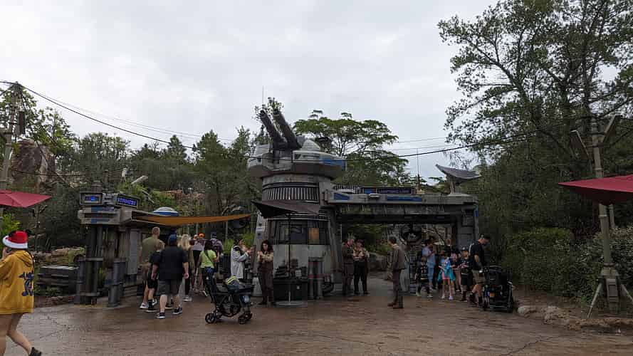 The first bit of the queue winds through the Batuu landscape.