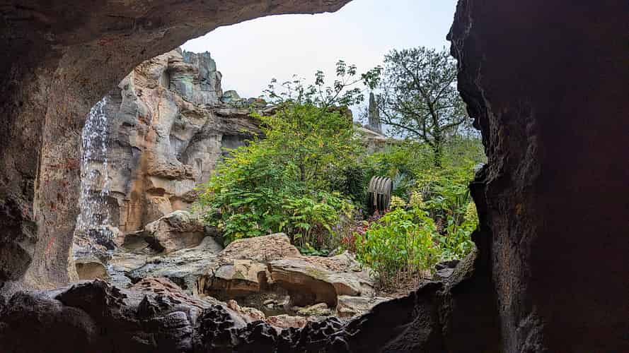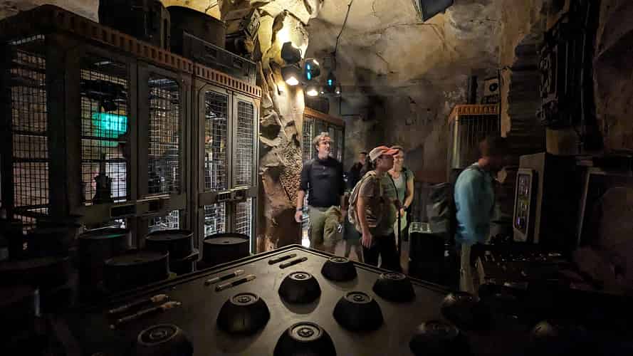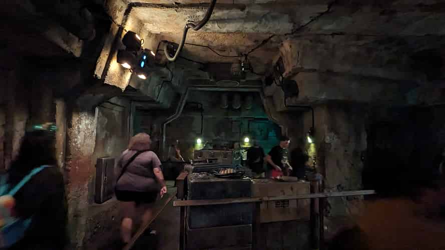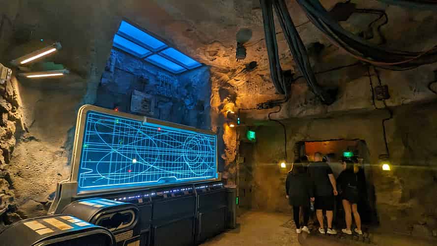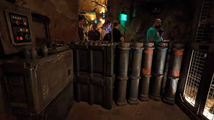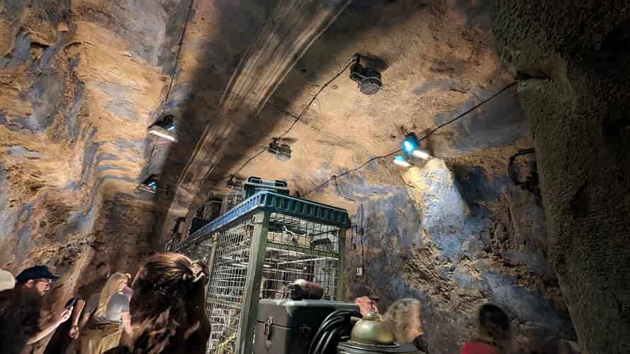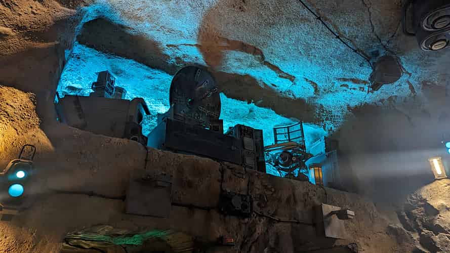 The queue moves into a system of caves, as well as chambers that have been cut out with blasters.