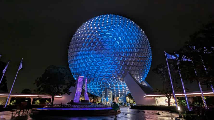 Spaceship Earth at night.