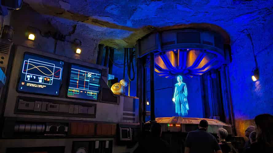 Suddenly, a holographic message from Rey appears. The resistance base you are standing in is no longer safe, so transport has been arranged for you from your current planet of Battu to another base on the planet of Bakara.