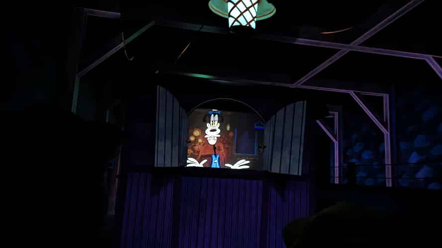 Goofy accidentally causes an explosion, blowing a hole in the screen and opening a portal to the cartoon world.