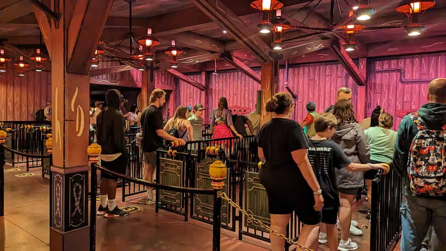 Guests board the ride inside a train depot.
