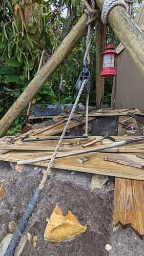 Spare pieces of track and supports are throughout the queue.