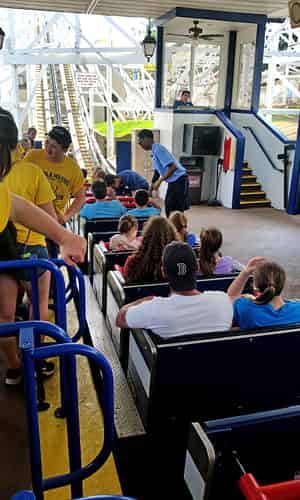 The trains feature "buzz bars" (So called because of the electrical buzzing sound made when locking). The bars don't actually touch the lap, rather they just sit across, well above, and mainly serve to stop riders from trying to stand up. A secondary seatbelt holds you in.