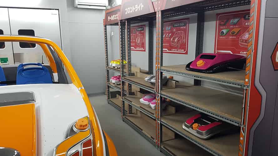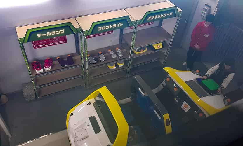 The first room has you picking modular parts off a wall. You have 90 seconds to fit them using a power screwdriver. An attendant checks before you are sent out onto the track.