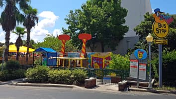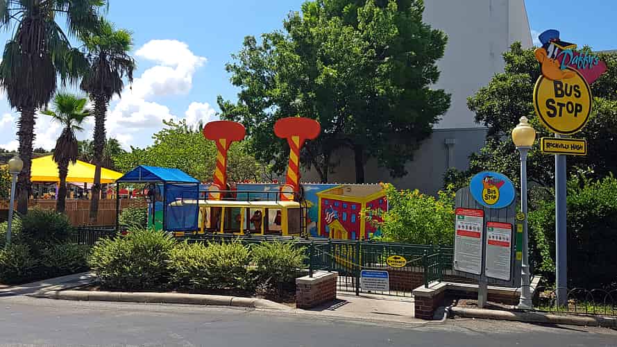 Fiesta Texas has a few looney tunes kids rides scattered around the park, themed to their relevant area. This ride is located next to Rockville High School.