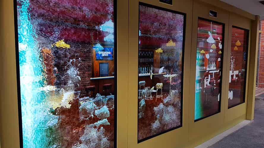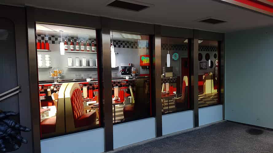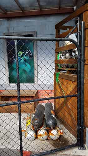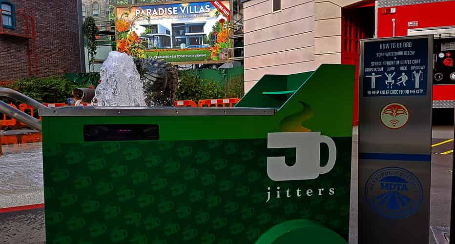 The full body motion control for the fountains is done behind this coffee cart. Net result: looks like you have drank too much coffee!