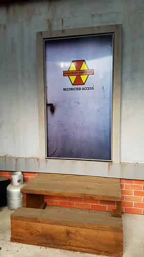 This shiny steel doorway leads to Project Cadmus, a genetic engineering project in the DC universe canon.