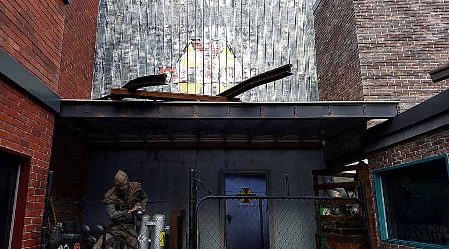 The maintenance stairs down to the pit beneath the ride have been themed as subway stairs, complete with the grime.