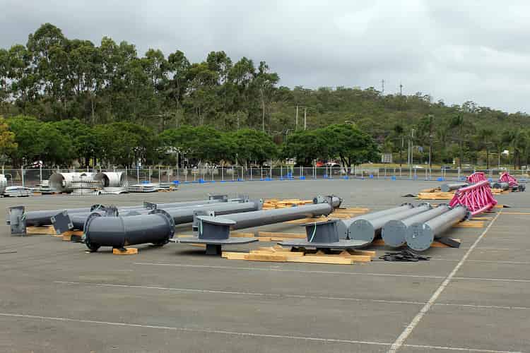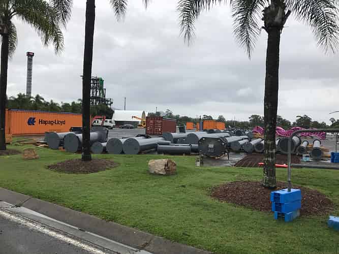 Many support columns have arrived but overall the staging area in car park is still quite sparse as construction crews wait for more track shipments from Germany.