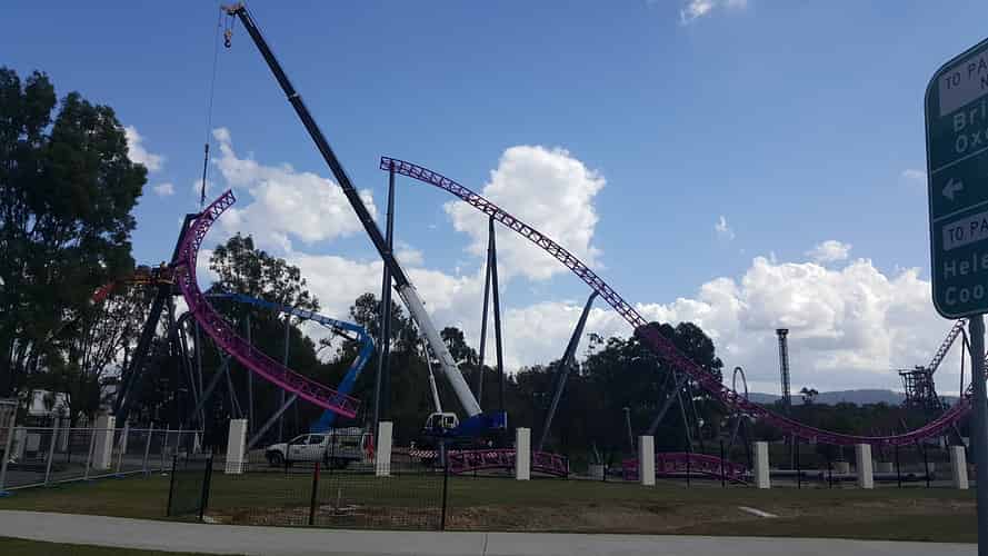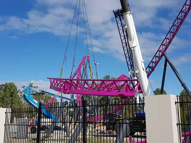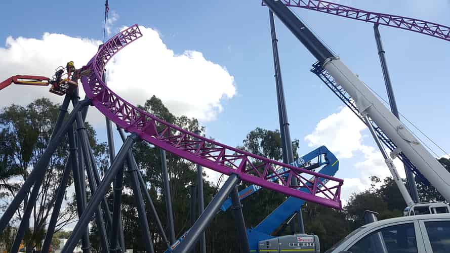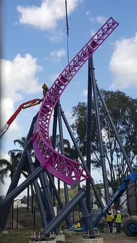 The next section being lifted into place. If you look closely this is actually two sections of track already bolted together. To facilitate shipping, some of the more twisted sections of track are shorter in length.