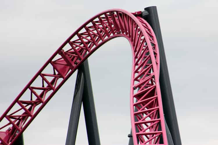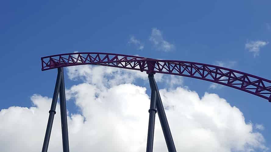 The inclined dive loop is completed; a ground-hugging turn will connect it with the next element on the roller coaster.