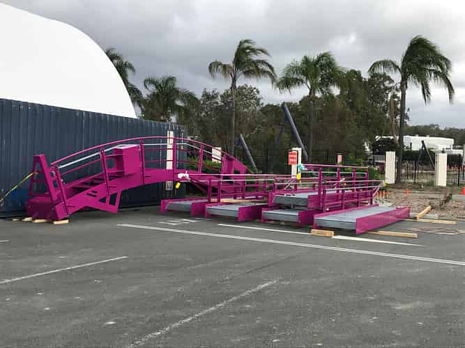 Stairs that will be situated alongside the ride's colossal lift hill. The curved section at the left will be located at the highest point of the ride's lift hill.