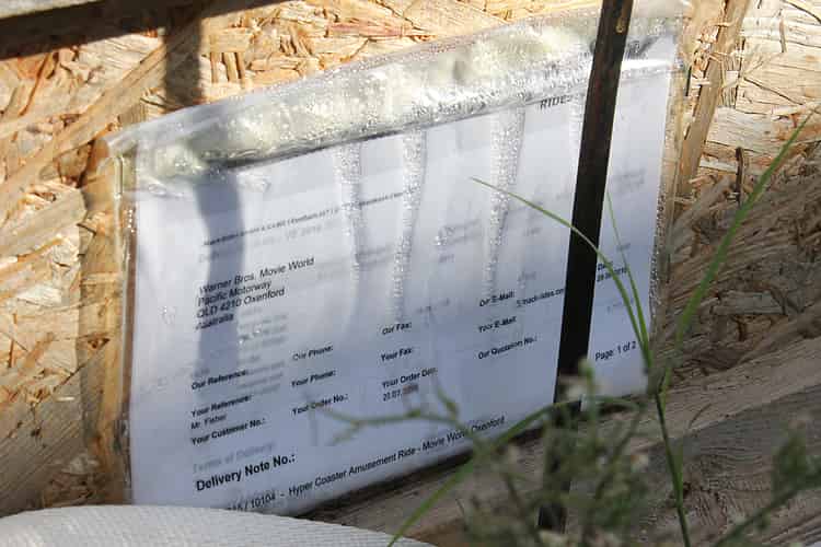 A packaging slip on one of the Mack Rides crates confirms the style of ride and also the date that the ride was officially ordered: 28 July 2015. Mr Fisher is Tim Fisher, CEO of Village Roadshow Theme Parks.