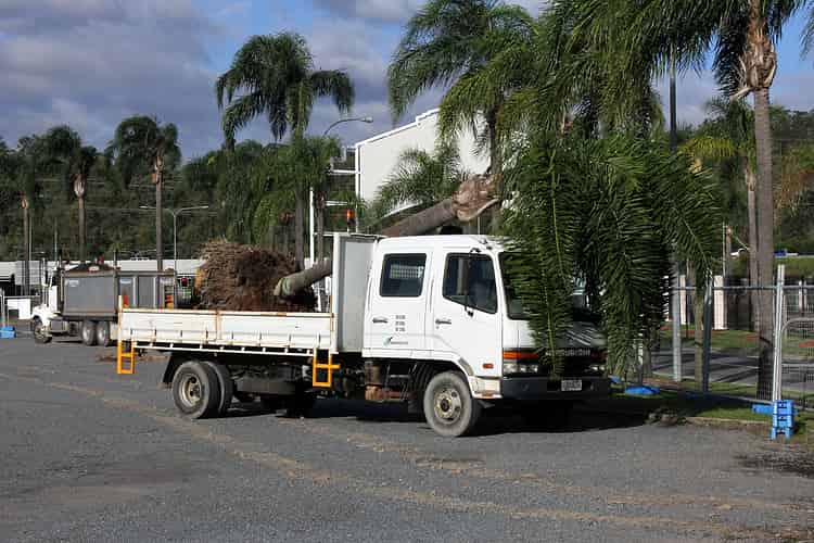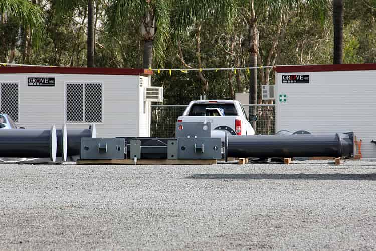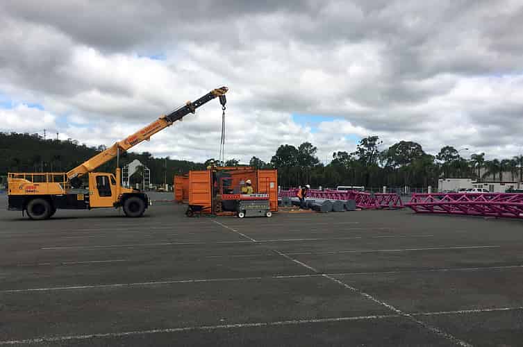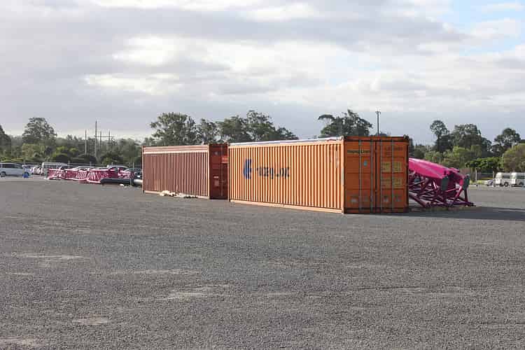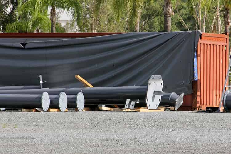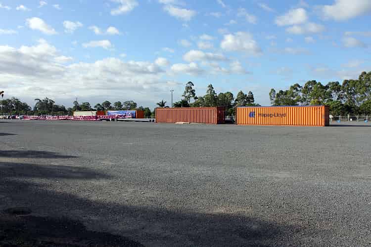 Track is delivered in open-top containers. Each section is lifted out with a crane and placed into the staging area.