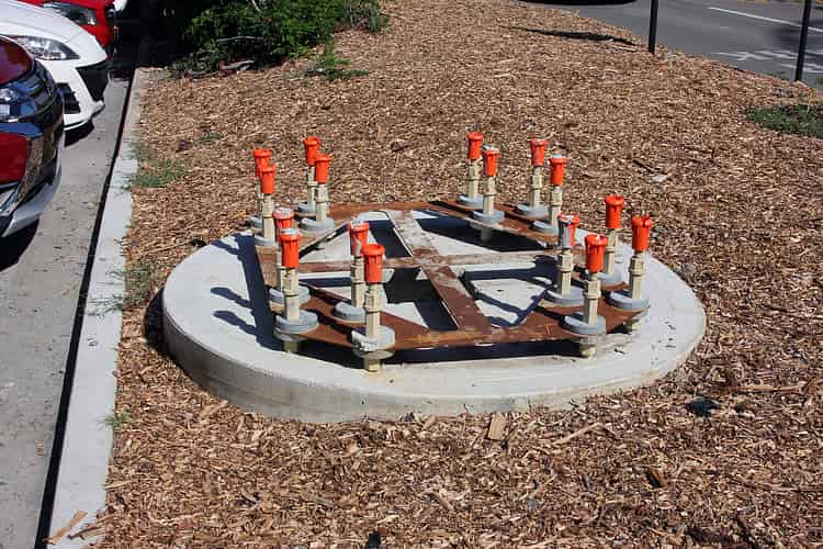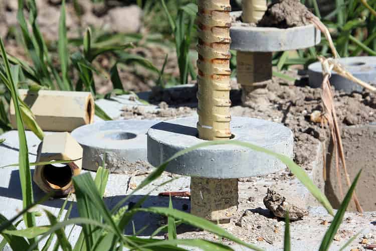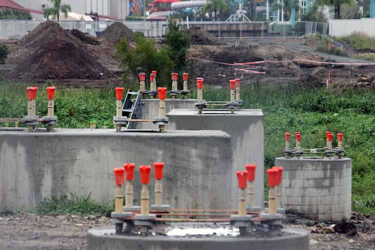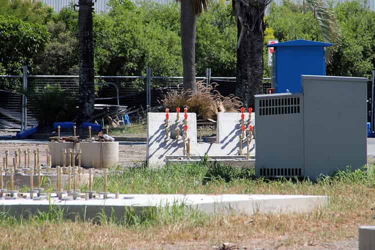 Nuts and washers have been removed from many of the footings in preparation for the installation of support columns.