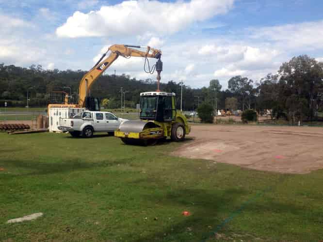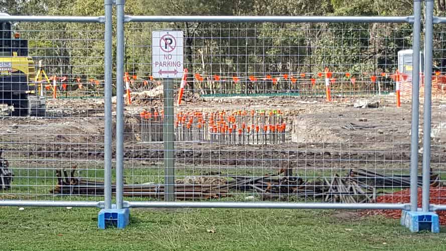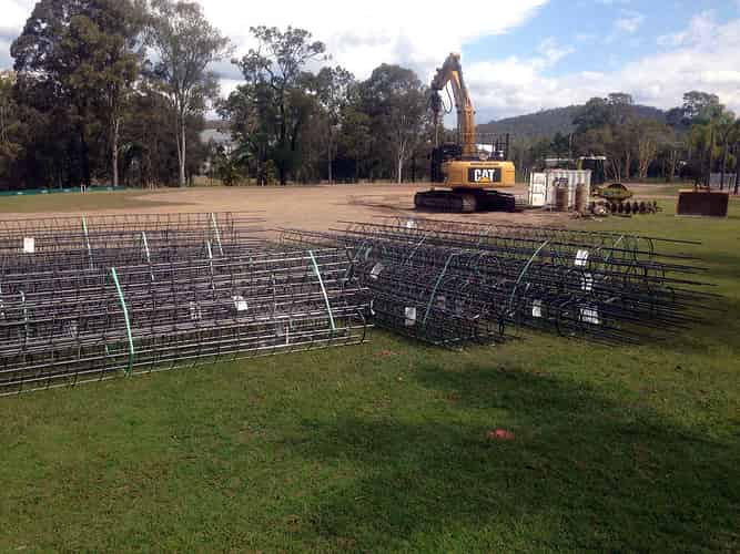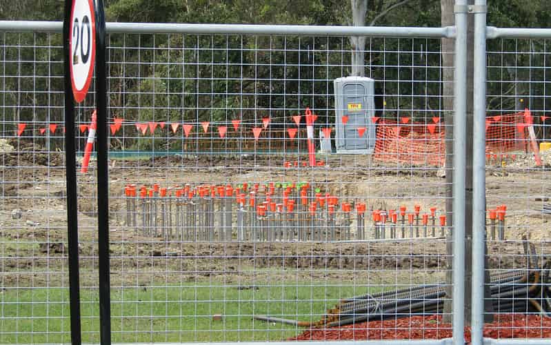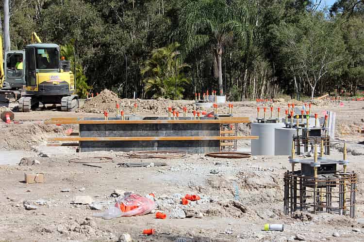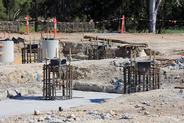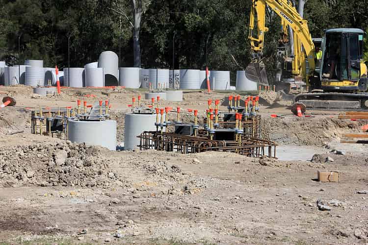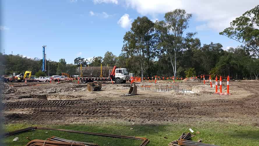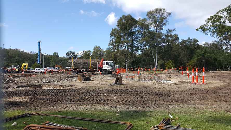 In addition to the cylindrical footings of various sizes, the construction site also features several of these particularly large rectangular footings.