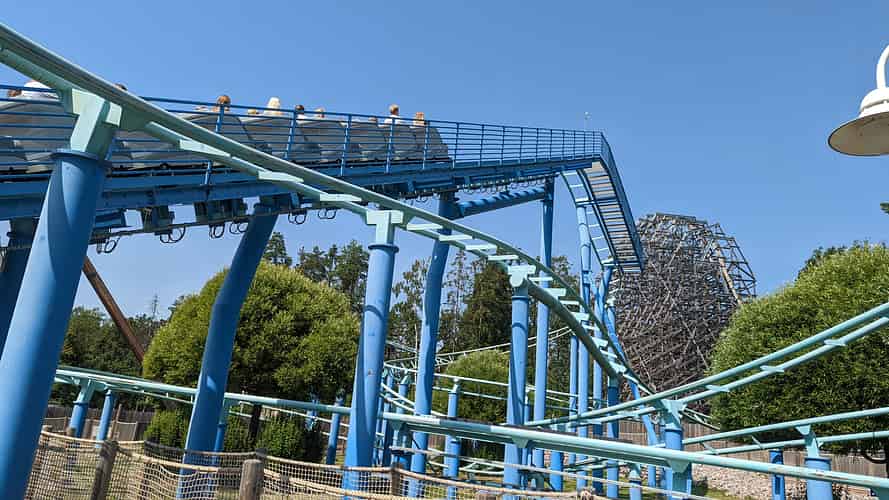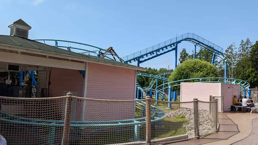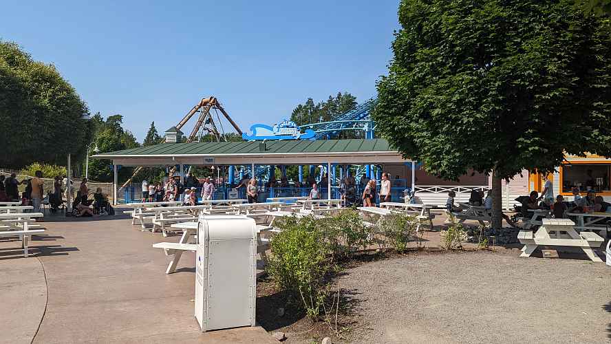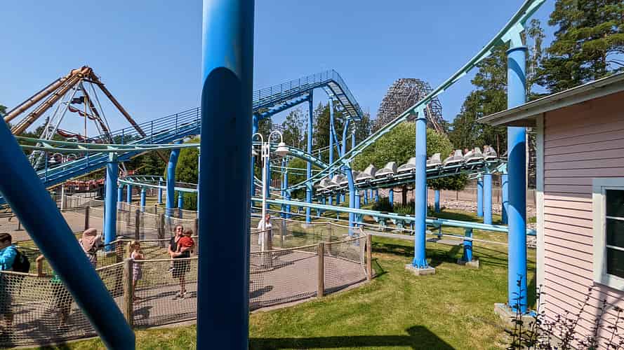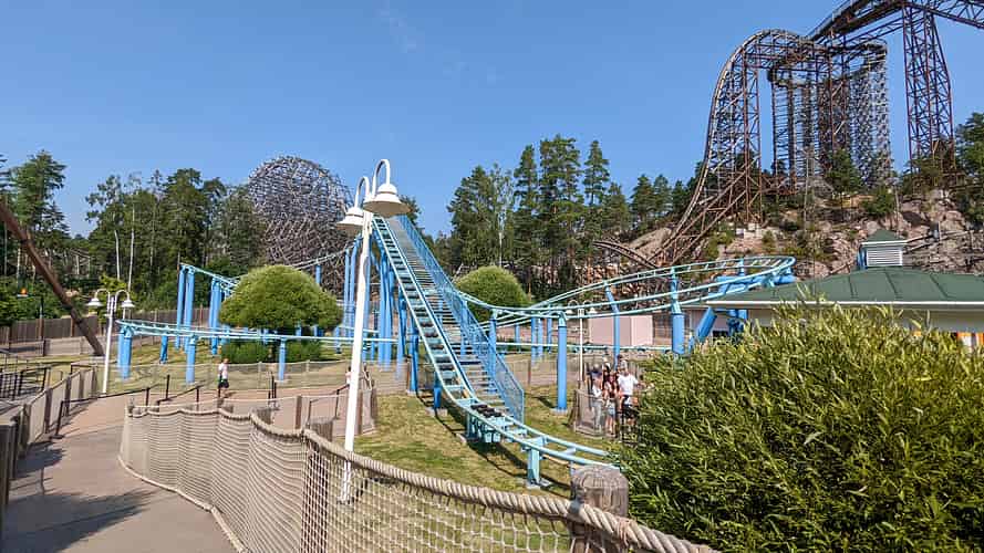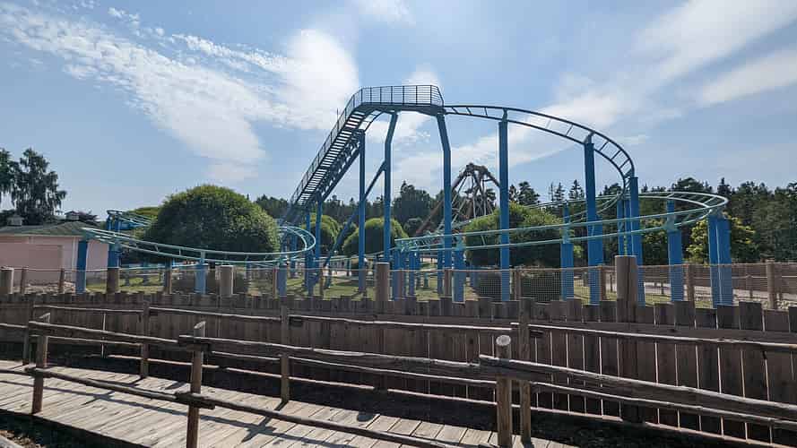 Delfinexpressen is a standard model Vekoma Rollerskater with Dolphin themed trains.