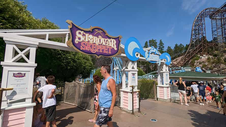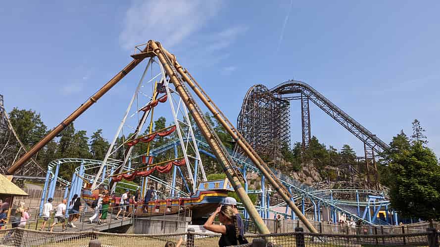 Sjorovarskeppet (Pirate ship) in front of Delfinexpressen (Family coaster) and Wildfire (Wooden Hybrid coaster)