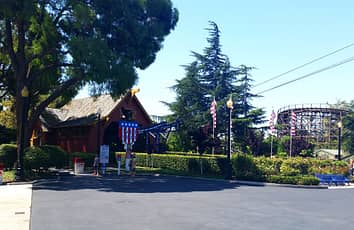 Some of the skyline of California's Great America, including the Action Theatre, Vortex, Star Tower FireFall and Delta Flyer/Eagle's Flight.