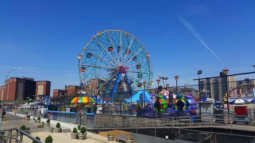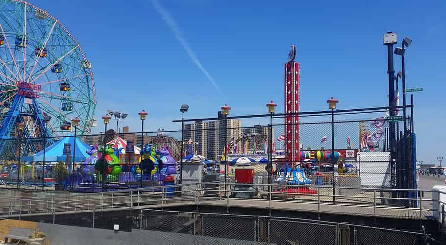 A few Luna Park rides, including the Electro Spin, Circus Coaster, and Tea Party. The Wonder Wheel at Deno's Wonderwheel Amusement Park is next door.