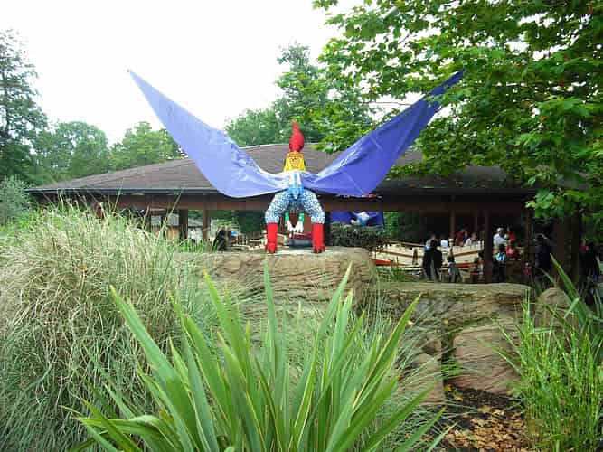 On dino dipper, guests ride in train shaped cars around an undulating track.