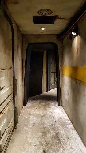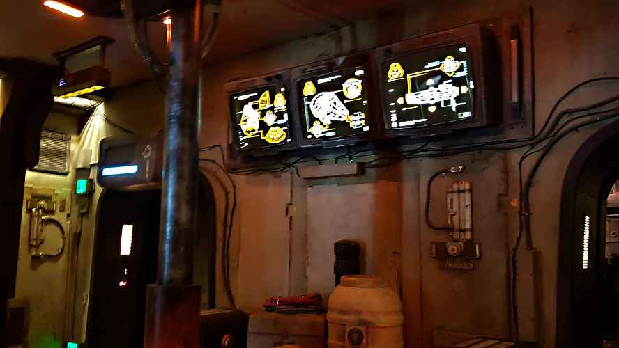 The ride entrance. Nothing announces the name of the attraction. The standard Disney array of entrance signs is the only clue a ride is in here.