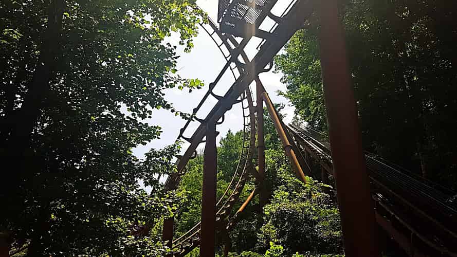 A vertical lift out of the first indoor section rises through a poppet head and into a few turns and dips on a bridge.