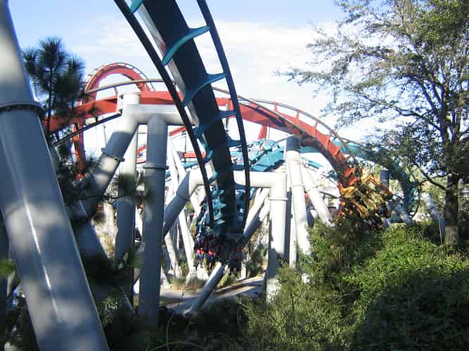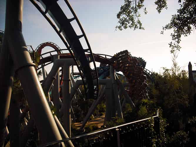 After the loops, the trains breeze past each other through interlocking corkscrews.