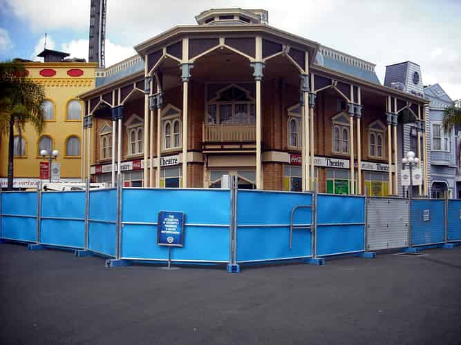 The removed ride exposes the back of the cinema building.