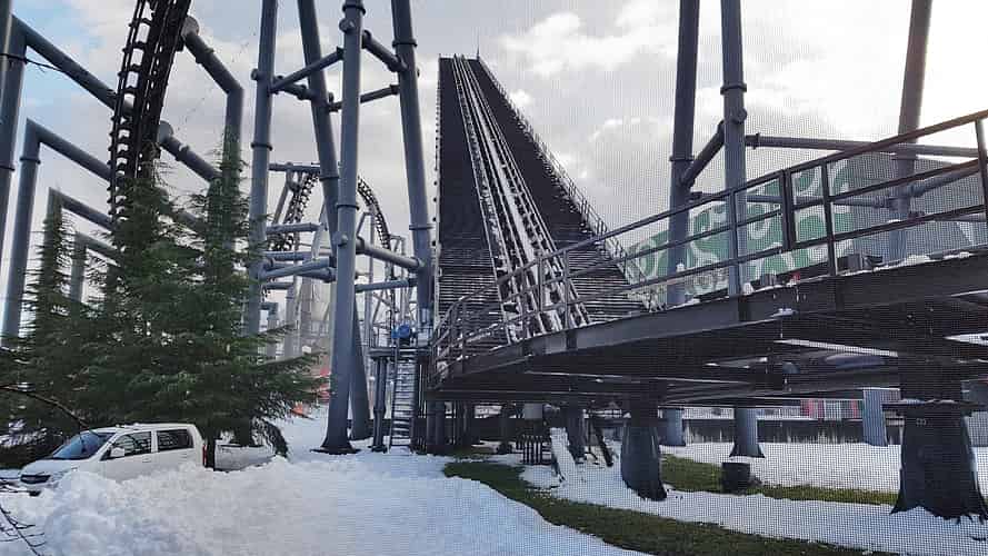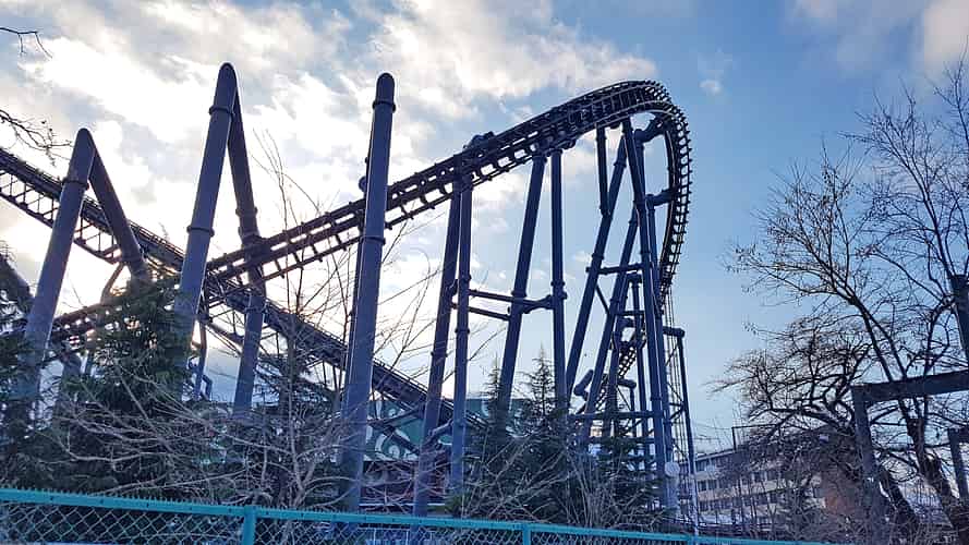 The bottom of the first drop, where trains hit 126 km/h.