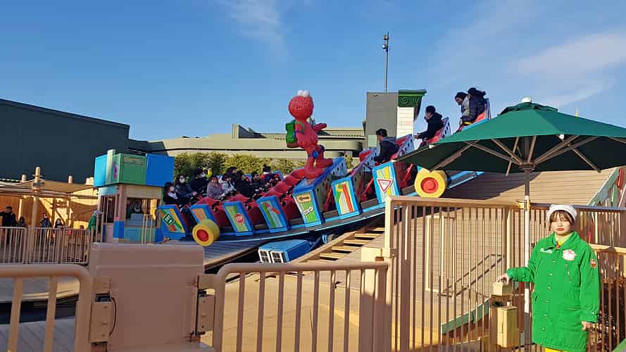 Elmo's Go Go Skateboard is a skater ride where riders sit in a giant skateboard that moves back and forth in a quarter pipe.