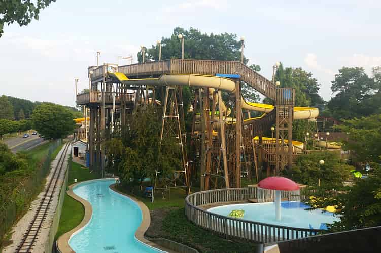 Presque Isle Plunge and Lake Erie Dip slides, with the Kiddle Pool area and Endless River beneath. L.Ruth express can be seen running down the left.