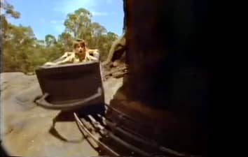 This still from a TV commercial for Dreamworld in the late 1980s shows the original ride's track and two-seat cars. The later Eureka Mountain Mine Ride featured larger, four-seat vehicles, a different track design and no turns this tight.