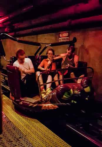 The ride takes place in this building, and follows a layout similar to rides such as Primeval Whirl at Disneys Animal Kingdom. The theming on the main ride itself echoes the style seen in the queue, with one highlight being passing through a boiler room.