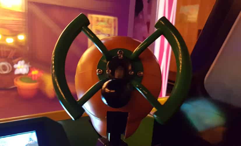 Much like the first ride of this kind -Toy Story Mania- , this ride uses a blaster with a pull cord used to shoot projectiles at objects on screen. The harder you pull and the steeper you tilt, the further your projectile will go.
