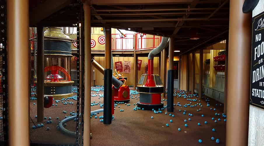 It's an indoor playground, featuring an area where kids can collect foam balls, suck them up with hoses, and shoot them out of cannons (At each other, or at targets)