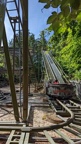 The ride starts with an initial set of switchbacks, with the car facing fowards.