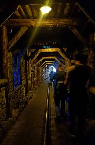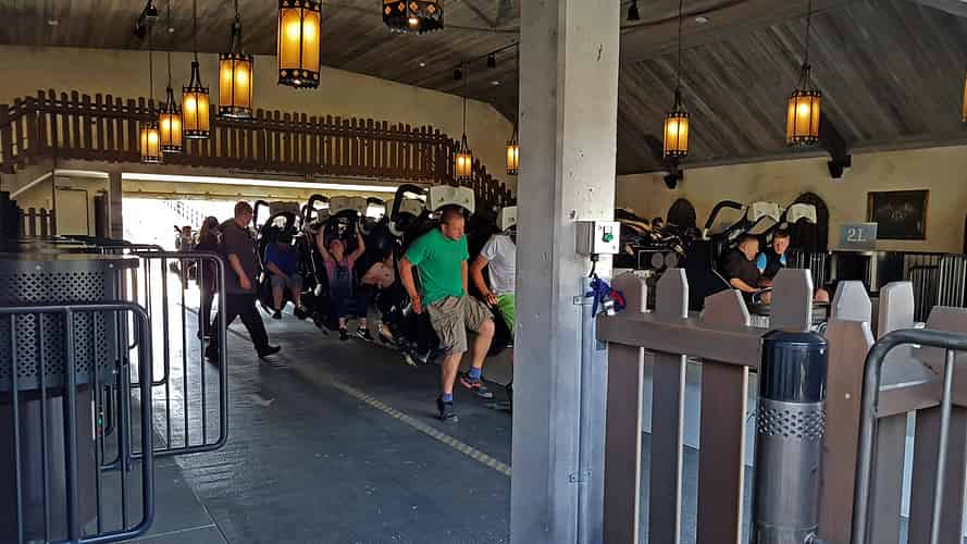 The ride is quite tangled, and makes good use of the hillside. It was built on the site of an old log flume, and re-used a few of the old buildings for the queue line.