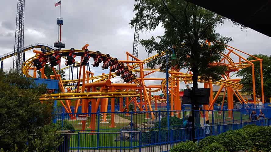 The southeastern side of the park, where we can see Nighthawk, RipCord, Flying Ace Aerial Chase, Windseeker, Intimidator, Southern Star and Afterburn