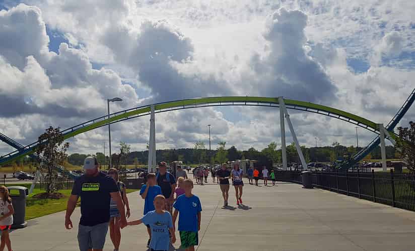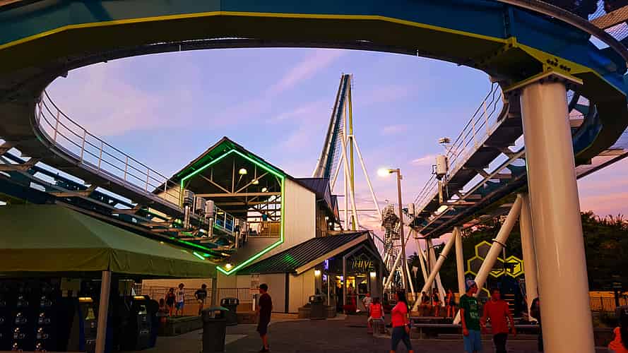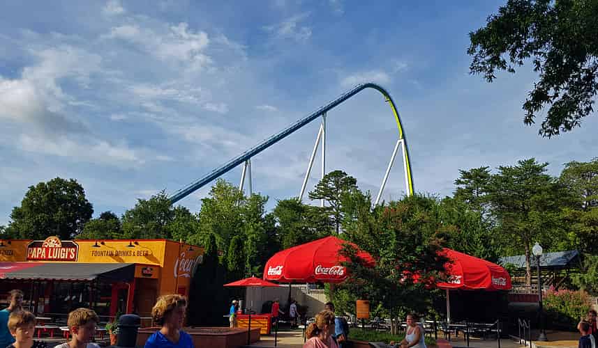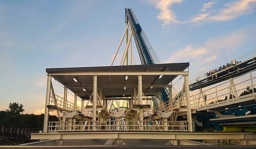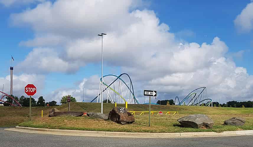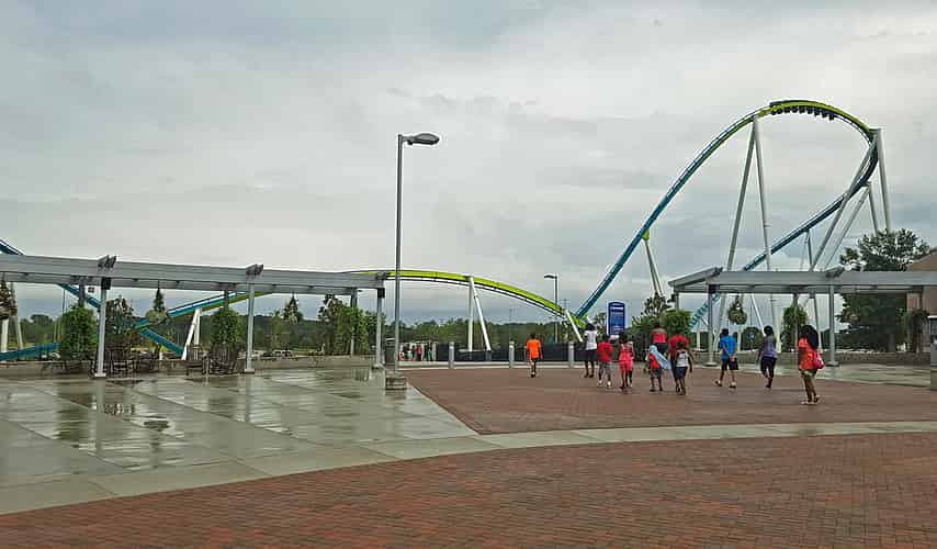 Much like Gatekeeper at Cedar Point, the track of Fury 325 is used to frame the grand entry to Carowinds.
