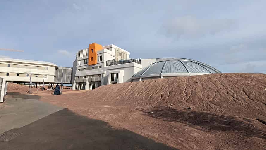 Designed to look like a space habitat that has been installed on stilts.