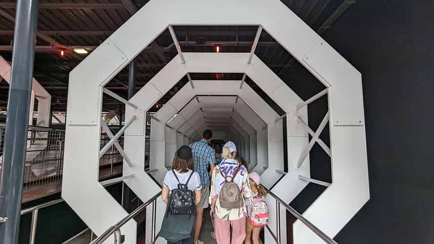 The queue features small exhibits related to space training and exploration.