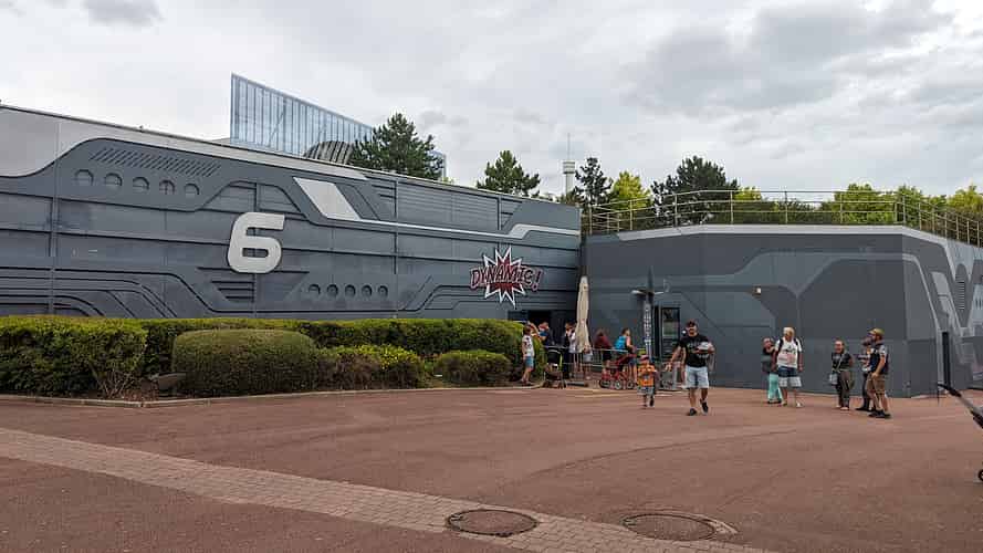 Objectif Mars is a spinning coaster from Intamin, featuring dark ride scenes, two launches, and a surprise drop track at the end.