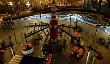 This magic bikes ride features flying fish revolving around a light house.