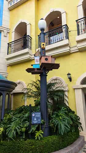 Speakers are disguised in bird boxes.