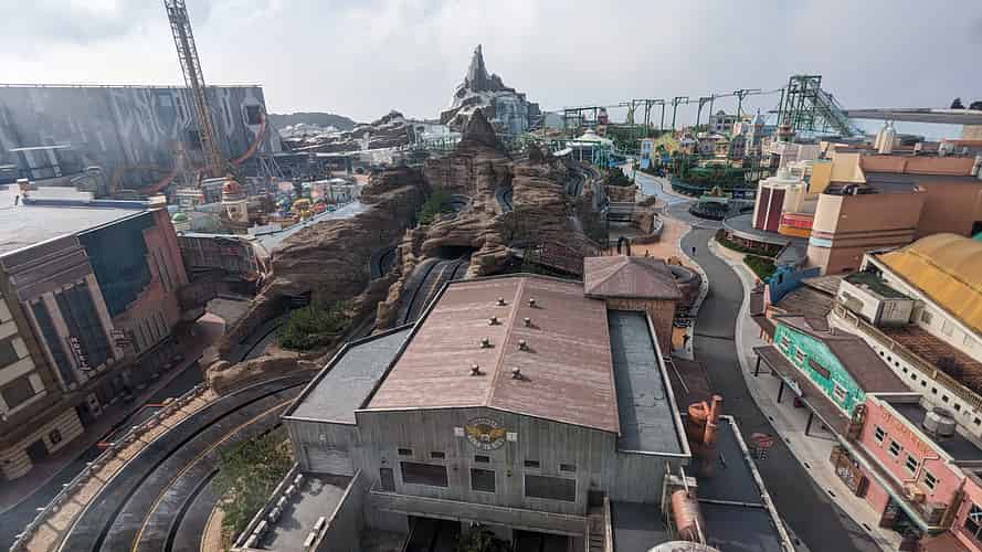 Screens showing wait times and closures are throughout the park.